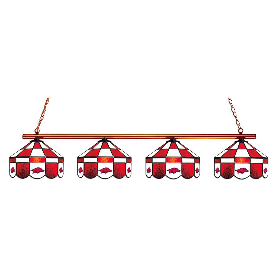 Let your team spirit shine with this beautifully constructed high-quality stained glass Arkansas Razorbacks 4-Light Executive Game Table Light. These officially licensed collegiate Tiffany-Style Stained Glass lamps are a perfect addition to any Razorbacks themed gameroom or man cave. These Tiffany-Style lights use the same opalescent art glass that was used by Tiffany years ago. Each piece of glass is individually cut, leaded and soldered together by hand with the same care and craftsmanship as the original Tiffany works of art.
