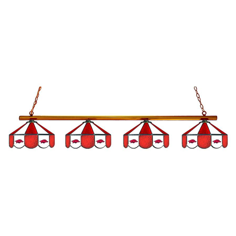 Let your team spirit shine with this beautifully constructed high-quality stained glass Arkansas Razorbacks 4-Light Game Table Light. These officially licensed collegiate Tiffany-Style Stained Glass lamps are a perfect addition to any Razorbacks themed gameroom or man cave. These Tiffany-Style lights use the same opalescent art glass that was used by Tiffany years ago. Each piece of glass is individually cut, leaded and soldered together by hand with the same care and craftsmanship as the original Tiffany works of art.