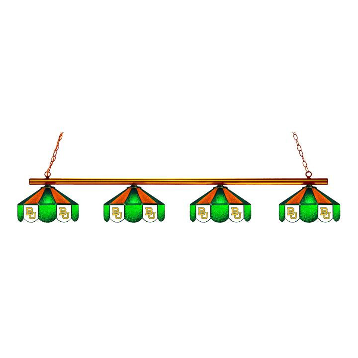Let your team spirit shine with this beautifully constructed high-quality stained glass Baylor Bears 4-Light Game Table Light. These officially licensed collegiate Tiffany-Style Stained Glass lamps are a perfect addition to any Bears themed gameroom or man cave. These Tiffany-Style lights use the same opalescent art glass that was used by Tiffany years ago. Each piece of glass is individually cut, leaded and soldered together by hand with the same care and craftsmanship as the original Tiffany works of art.