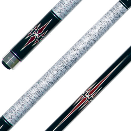 Classic simple design on a cue that commands respect. The forearm, butt sleeve, and butt plate are all black. Four floating points outlined in white adorn the forearm with a matching design on the butt sleeve. The wrap is white and black pressed irish linen. Silver rings adorn the butt from one end to the other. The cue also has a unique stainless steel butt cap.This pool cue has a white hard rock maple shaft, 13 mm linen fibre ferrule, and a Le Pro tip. The joint is a 5/16-14 stainless steel piloted joint. Blaze cues are well-balanced for solid hit control.