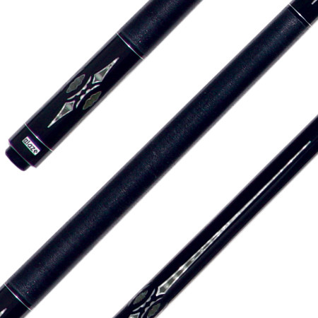 This pool cue has an ebony forearm and butt sleeve. The forearm and butt sleeve are adorned with four points of tinted malachite which are outlined in gray pearl. The joint and butt cap feature silver rings. Blaze Cues are known for being well-balanced for a solid hit and control.