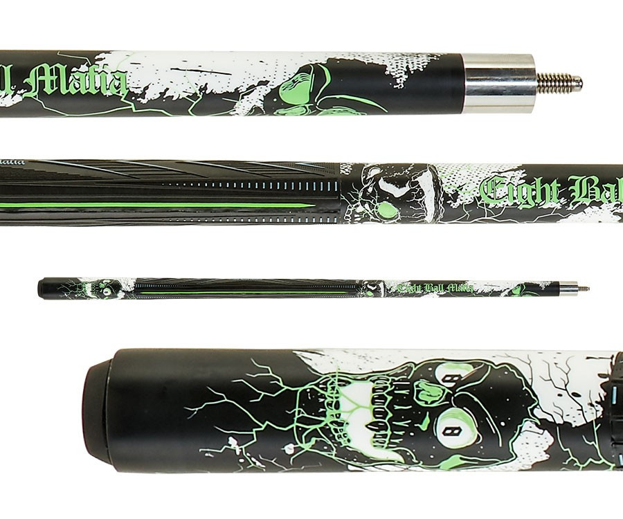 Eight Ball Mafia cues offer performance and value. All of the cues in the Eight Ball Mafia series feature original grunge art deathscapes with flames, skulls, crossbones and brass knuckles. Each cue is meticulously crafted and features a Canadian hard rock maple forearm and butt sleeve. The forearm of the Eight Ball Mafia EBM21 features a black background with neon green and white lighting strikes and skulls. The butt sleeve of the cue features the same black background with multiple neon green accented skulls.