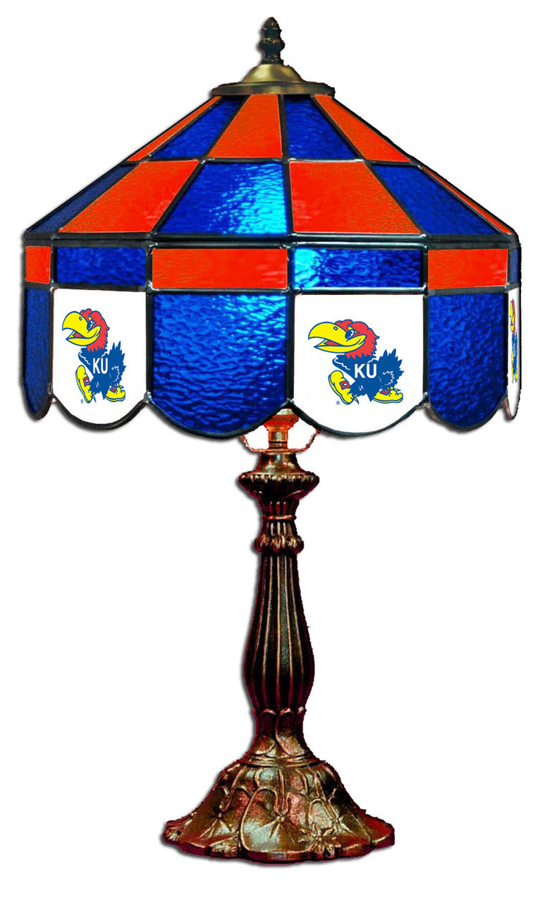 Let your team spirit shine with this beautifully constructed high-quality stained glass Kansas Jayhawks 14 Executive Table Lamp. These officially licensed collegiate Tiffany-Style Stained Glass lamps are a perfect addition to any Jayhawks themed gameroom or man cave. These Tiffany-Style lights use the same opalescent art glass that was used by Tiffany years ago. Each piece of glass is individually cut, leaded and soldered together by hand with the same care and craftsmanship as the original Tiffany works of art.