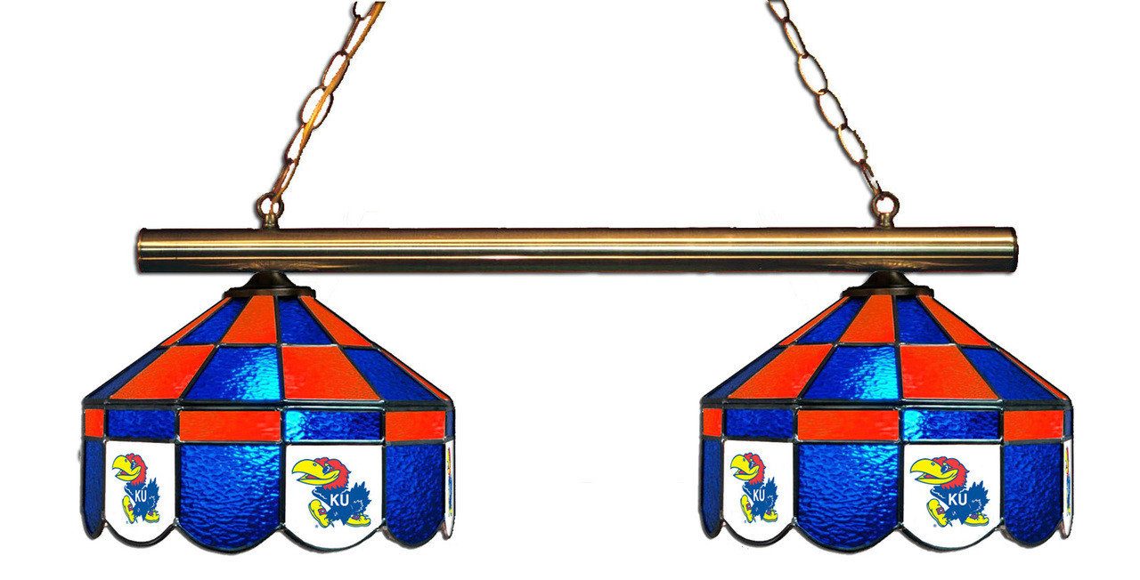 Let your team spirit shine with this beautifully constructed high-quality stained glass Kansas Jayhawks 2-Light Executive Game Table Light. These officially licensed collegiate Tiffany-Style Stained Glass lamps are a perfect addition to any Jayhawkss themed gameroom or man cave. These Tiffany-Style lights use the same opalescent art glass that was used by Tiffany years ago. Each piece of glass is individually cut, leaded and soldered together by hand with the same care and craftsmanship as the original Tiffany works of art.