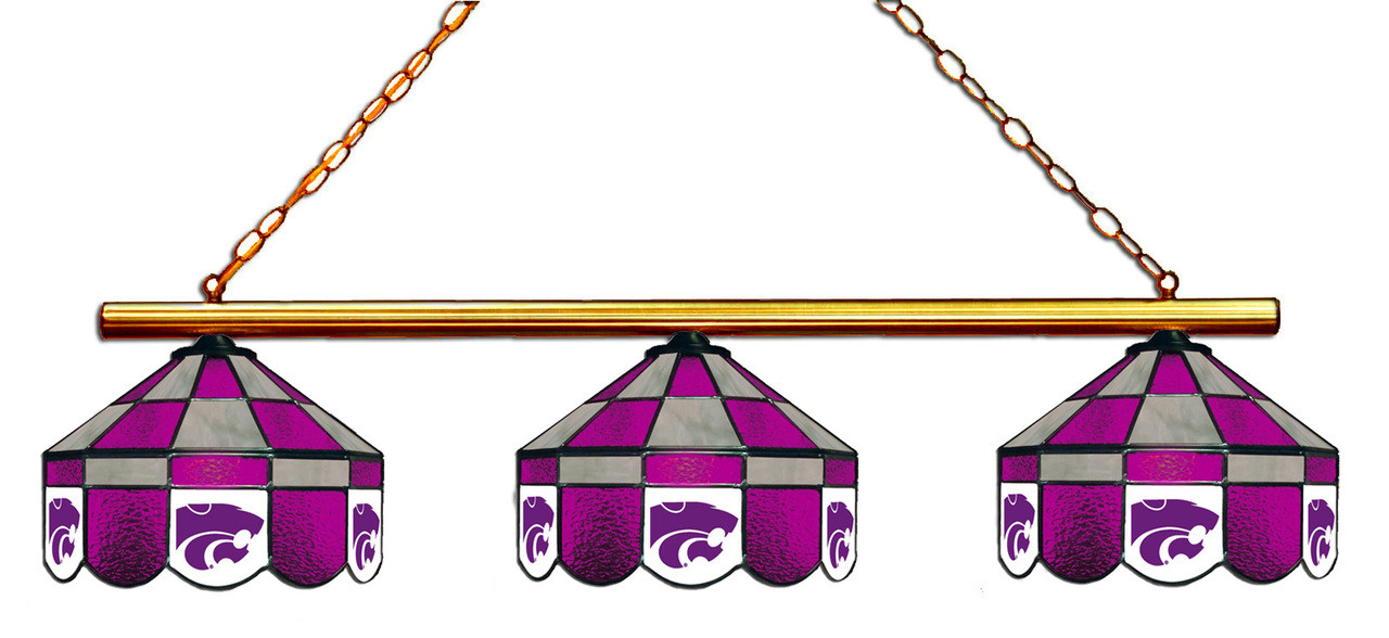 Let your team spirit shine with this beautifully constructed high-quality stained glass Kansas State Wildcats 3-Light Executive Game Table Light. These officially licensed collegiate Tiffany-Style Stained Glass lamps are a perfect addition to any Wildcats themed gameroom or man cave. These Tiffany-Style lights use the same opalescent art glass that was used by Tiffany years ago. Each piece of glass is individually cut, leaded and soldered together by hand with the same care and craftsmanship as the original Tiffany works of art.- Dimensions: 14H X 54L with 3 X 14 Diameter Lamps