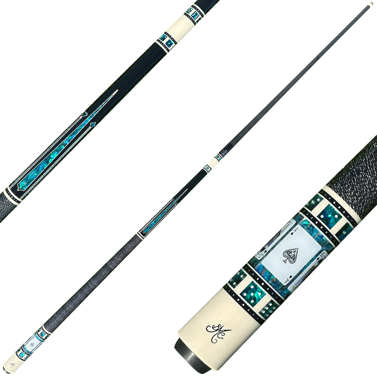 The butt sleeve consists of a 4-card royal flush in spades over a 48-piece blue Paua Shell sleeve trimmed with white on either side. Above and below this card sleeve are 6 Blue Paua Shell dice with white numbering bordered on either side by 24 1/32 x1/16 silver rectangles. All is set in a white background. The dice are surrounded by imitation ivory. The 5-inch lines on the forearm butt up against 24 silver 1/16x1/32 rectangles just above the wrap surrounded in black. The joint consists of 6 blue Paua Shell casino-type dice with white numbers bordered on either side by 24 1/16x1/32 silver rectangles all set in a black field. This design is repeated again in the shaft collar.