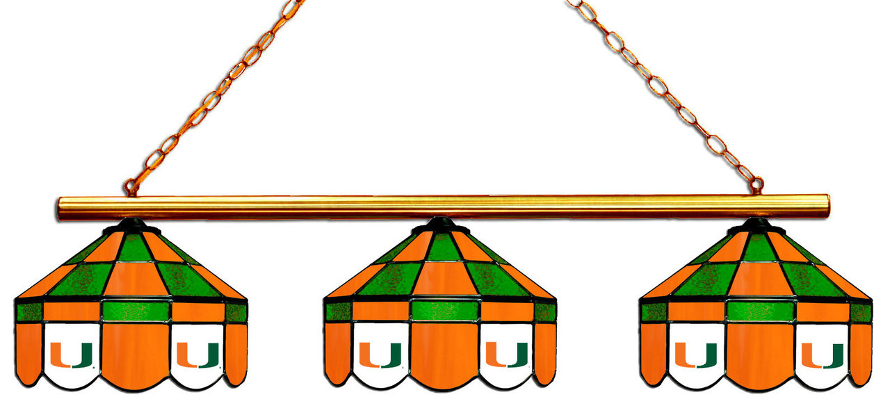 Let your team spirit shine with this beautifully constructed high-quality stained glass Miami Hurricanes 3-Light Executive Game Table Light. These officially licensed collegiate Tiffany-Style Stained Glass lamps are a perfect addition to any Hurricanes themed gameroom or man cave. These Tiffany-Style lights use the same opalescent art glass that was used by Tiffany years ago. Each piece of glass is individually cut, leaded and soldered together by hand with the same care and craftsmanship as the original Tiffany works of art.