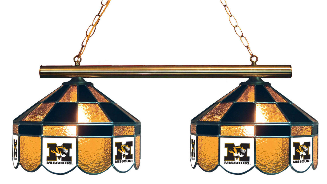 Let your team spirit shine with this beautifully constructed high-quality stained glass Missouri Tigers 2-Light Executive Game Table Light. These officially licensed collegiate Tiffany-Style Stained Glass lamps are a perfect addition to any Tigers themed gameroom or man cave. These Tiffany-Style lights use the same opalescent art glass that was used by Tiffany years ago. Each piece of glass is individually cut, leaded and soldered together by hand with the same care and craftsmanship as the original Tiffany works of art.- Dimensions: 13H X 34L with 2 X 14 Diameter Lamps