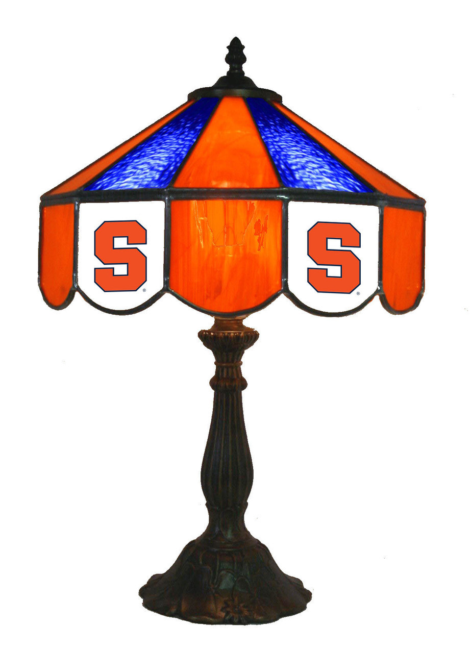 Let your team spirit shine with this beautifully constructed high-quality stained glass Syracuse Orange 14 Table Lamp. These officially licensed collegiate Tiffany-Style Stained Glass lamps are a perfect addition to any Orange themed gameroom or man cave. These Tiffany-Style lights use the same opalescent art glass that was used by Tiffany years ago. Each piece of glass is individually cut, leaded and soldered together by hand with the same care and craftsmanship as the original Tiffany works of art.- Dimensions: 10H X 14 Diameter