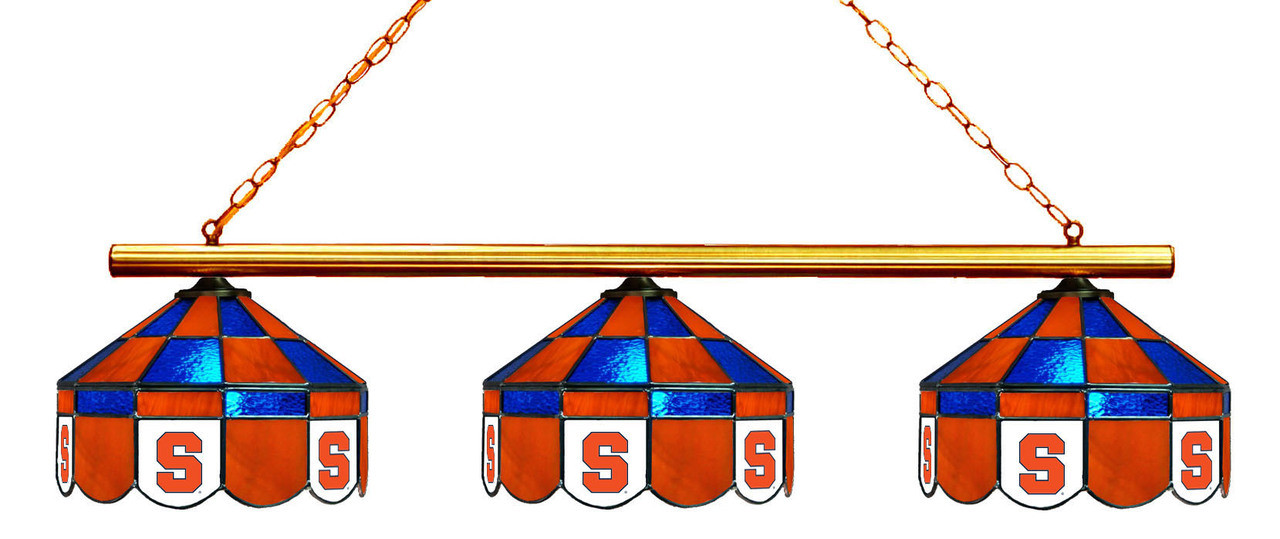 Let your team spirit shine with this beautifully constructed high-quality stained glass Syracuse Orange 3-Light Executive Game Table Light. These officially licensed collegiate Tiffany-Style Stained Glass lamps are a perfect addition to any Orange themed gameroom or man cave. These Tiffany-Style lights use the same opalescent art glass that was used by Tiffany years ago. Each piece of glass is individually cut, leaded and soldered together by hand with the same care and craftsmanship as the original Tiffany works of art.- Dimensions: 14H X 54L with 3 X 14 Diameter Lamps