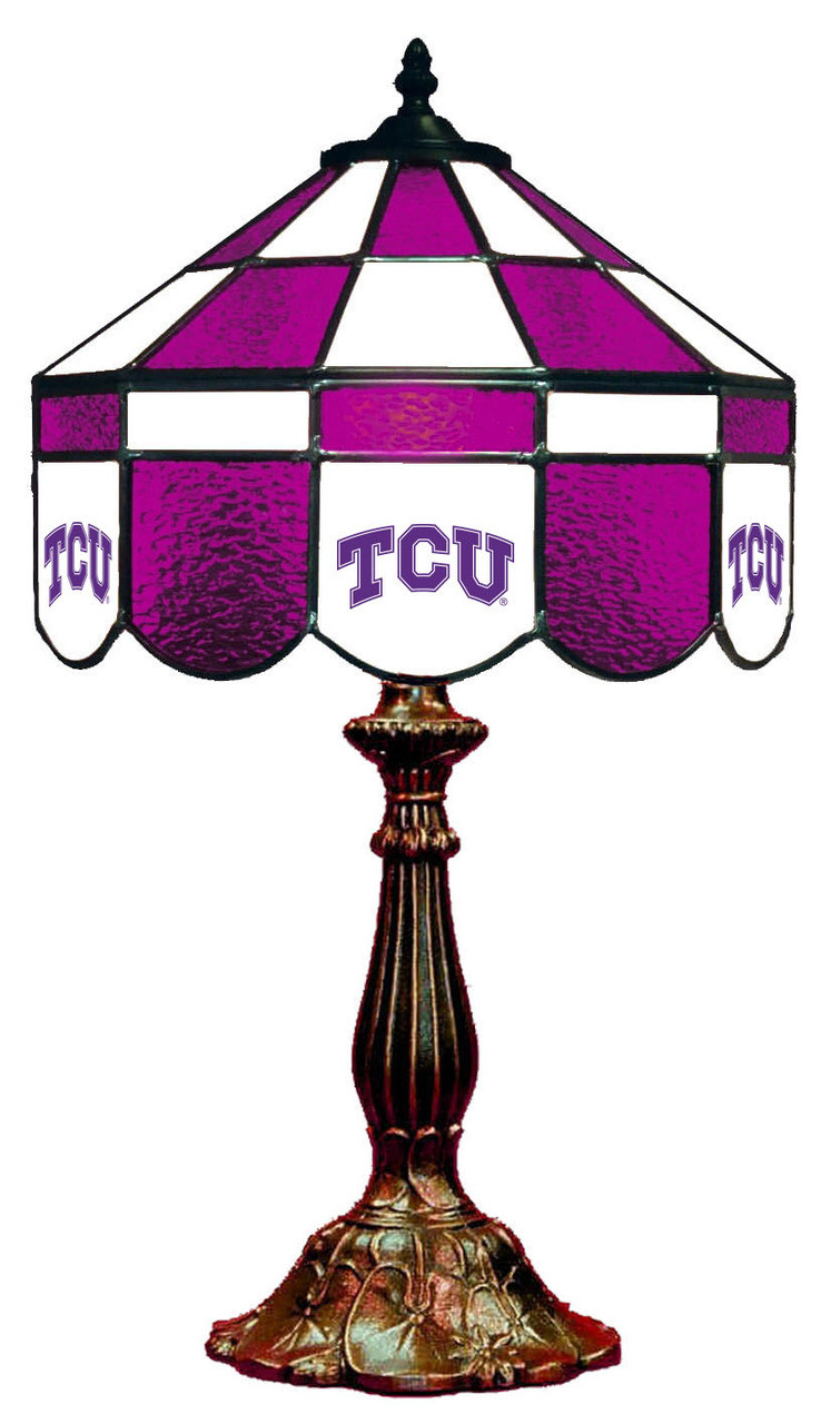Let your team spirit shine with this beautifully constructed high-quality stained glass TCU Horned Frogs 14 Executive Table Lamp. These officially licensed collegiate Tiffany-Style Stained Glass lamps are a perfect addition to any Horned Frogs themed gameroom or man cave. These Tiffany-Style lights use the same opalescent art glass that was used by Tiffany years ago. Each piece of glass is individually cut, leaded and soldered together by hand with the same care and craftsmanship as the original Tiffany works of art.- Dimensions: 11H X 14 Diameter