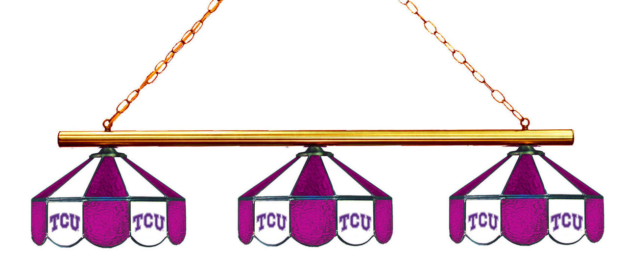 Let your team spirit shine with this beautifully constructed high-quality stained glass TCU Horned Frogs 3-Light Game Table Light. These officially licensed collegiate Tiffany-Style Stained Glass lamps are a perfect addition to any Horned Frogs themed gameroom or man cave. These Tiffany-Style lights use the same opalescent art glass that was used by Tiffany years ago. Each piece of glass is individually cut, leaded and soldered together by hand with the same care and craftsmanship as the original Tiffany works of art.- Dimensions: 13H X 54L with 3 X 14 Diameter Lamps